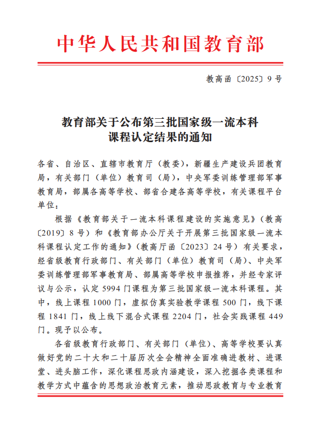 近日,教育部公布第三批国家级一流本科课程认定结果,我校13门课程成功入选,本轮入选总门数在全国药类大学中排名第4。截至目前,学校累计获批国家级一流本科课程达27门,位列全国医药类大学第11位(我校软科排名第17)。其中:第一批入选5门,第二批入选9门,第三批再添13门,课程覆盖线上、线下、线上线下混合式、虚拟仿真实验教学和社会实践五大类别,达成国家级一流本科课程全类别覆盖的建设目标。