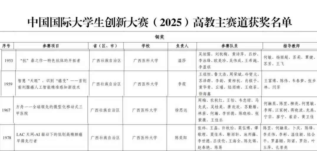 近日,教育部公布中国国际大学生创新大赛(2025)全国总决赛获奖结果,我校学子在全国高校参赛队伍中奋勇争先,“抗”鼎之作——特色抗体的开拓者、智慧“天眼”——首创前列腺癌人工智能精准感知新技术、方舟——全球领先的微型化移动式三甲医院、LAC天网——AI驱动下的低创高精肺癌早筛先行者、肝早先知——肝癌早筛活检新势力5个项目成功斩获国家级铜奖。